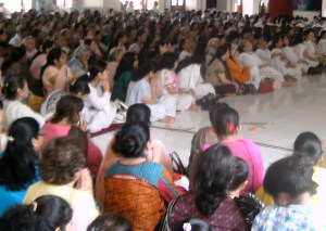El auditorio del satsang, un enorme salón de mármol en el centro de un antiguo castillo de la ciudad, se llenaba de devotos al cabo de las jornada de trabajo y el tapón vespertino. Gente de toda la urbe subía las breves escalinatas, se quitaba los zapatos y desahogaba sus pesares arrodillándose o poniendo una vela frente a la imagen del gurú fundador. Una silla vacía marcaba el lugar donde se sentaría el gurú actual que no estaba en India. Mujeres vestidas en conjuntos de punjabi y saris se sentaban en el lado derecho del salón (las ashramitas de blanco y las devotas regulares de diferentes colores) y los hombres en el lado izquierdo. Yo había optado por kurtas y pantalones sin la dupatta (estola).