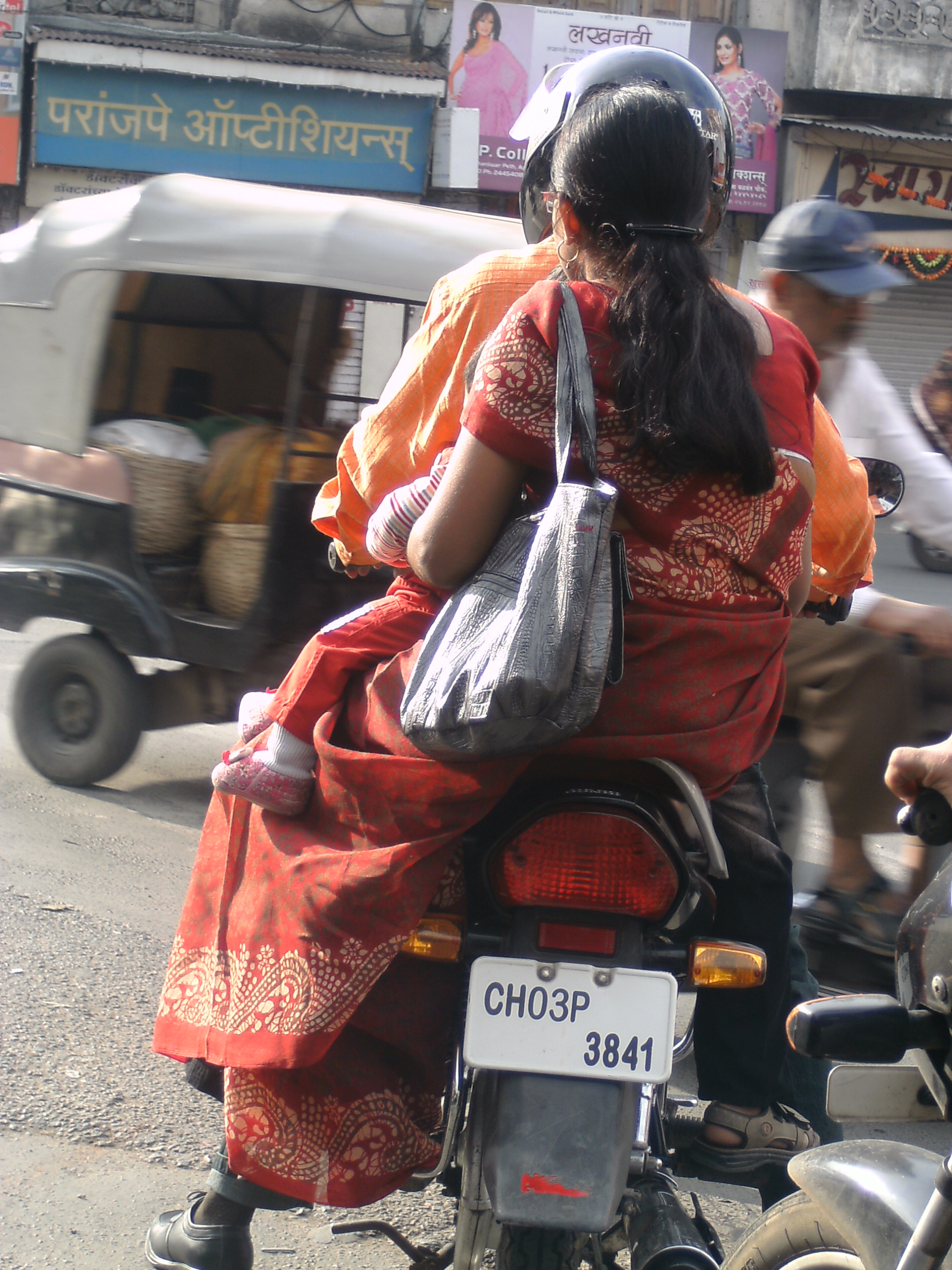 Si algo admiro de las mujeres en India, es que viajan en motora y luchan en el tráfico dragonesco vistiendo un elegante sari o conjunto de punjabi con sandalias. A veces, con una canasta en la cabeza y uno o más bebés en la falda -sin car seat- mientras el marido maneja el manubrio. Sean pobres o acaudaladas, el sari o punjabi siempre es de tela delicada y colores vistosos, a veces con pedrería, espejos diminutos y bordados dorados.