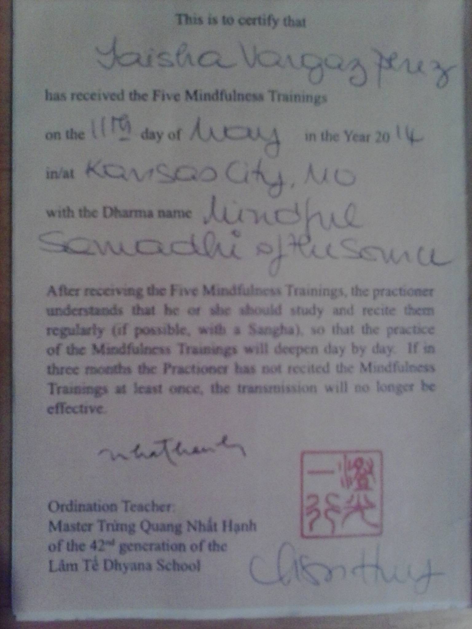 Lista para dejar ir mi nombre espiritual, pedí un nombre nuevo para este camino espiritual que se abrió ante mí. Al final de una hermosa ceremonia, recibí un certificado: “Consciencia Plena de la Fuente del Samadhi”. Con sencillez y ternura, este maestro me enseñó que yo era igual que los demás, parte de una red de conciencia que incluye a toda la humanidad. Me dio la bienvenida y me enseñó un nuevo hogar en mí misma, construido con palabras gentiles. Mi búsqueda incansable, a veces obsesiva, finalmente había terminado.