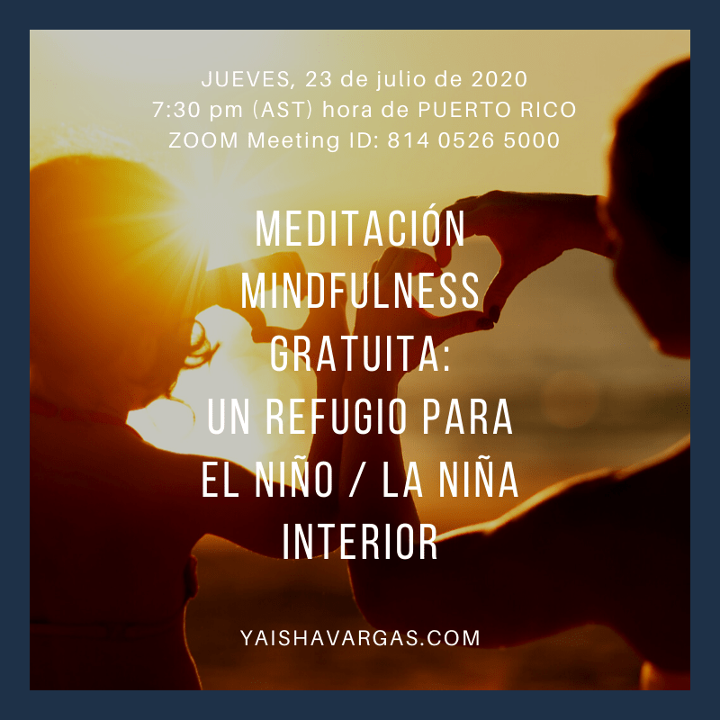 Bienvenid@ a esta meditación mindfulness gratuita. Practicaremos junt@s una adaptación de una meditación del maestro de mindfulness Thich Nhat Hanh del libro “Reconciliation: Healing the Inner Child”. Será este jueves, 23 de julio de 2020 a las 7:30 de la noche horario de Puerto Rico (Atlantic Standard Time). Puedes invitar a otras personas. Para conectarte ese día, oprime aquí: https://us02web.zoom.us/j/81405265000
