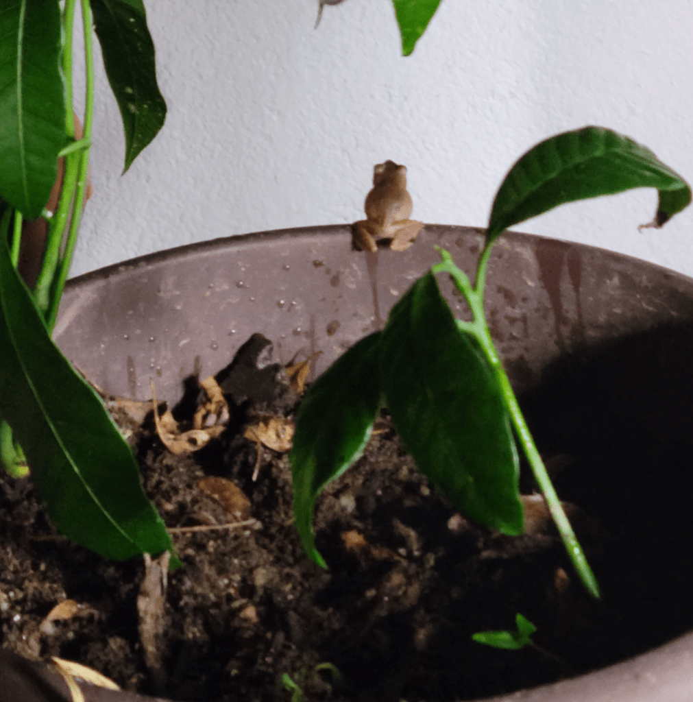 Hasta que anoche, mientras regaba un tiesto con plántulas de mangó, el inquilino del vivero saltó del tiesto y yo grité de la emoción: ¡al fín podría atraparlo para «liberarlo»!