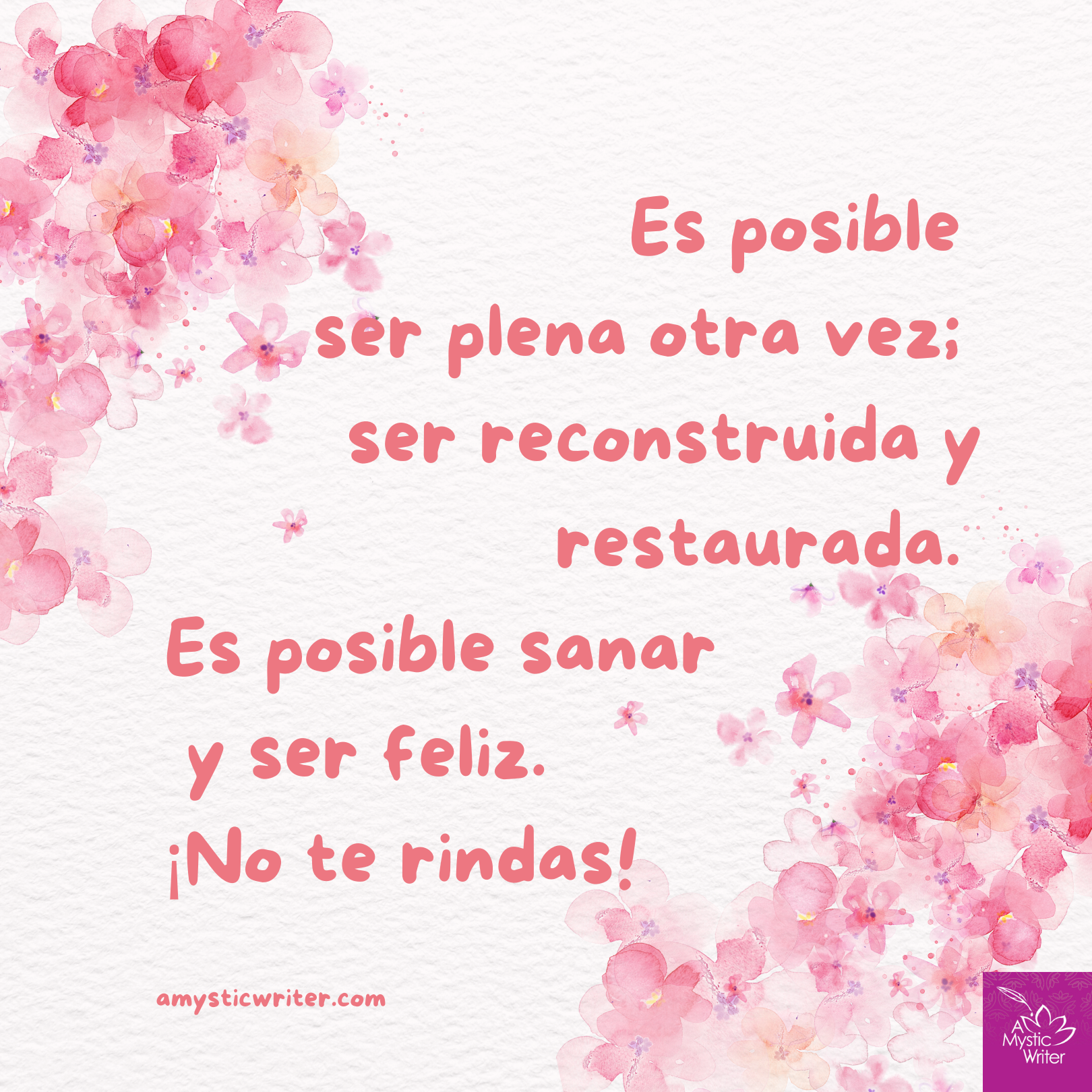 Te invito a abrazar el siguiente pensamiento hoy: «Es posible ser plena otra vez; ser reconstruida y restaurada. Es posible sanar y ser feliz: un día a la vez, una pasito a la vez, una respiración a la vez. A paso de tortuga se llega más rápido. ¡No te rindas!».