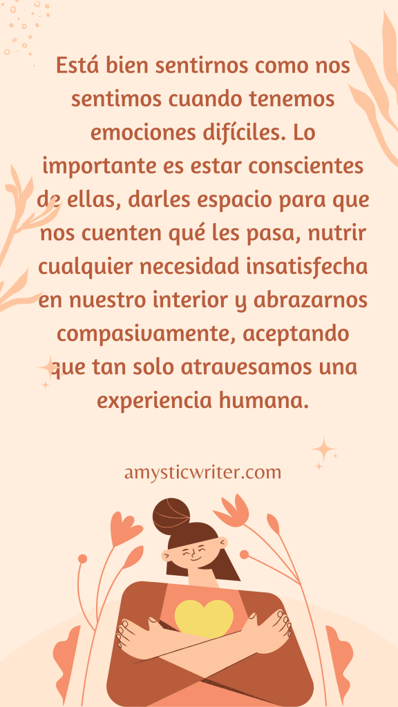 Nos abrazamos con todo lo que supone nuestra experiencia humana. Debido a que no exiliamos ninguna parte de nuestra experiencia, no sufrimos de negación, de autorrechazo, de pensar que somos menos, que no somos suficientes, que deberíamos sentirnos de otra manera o que nuestras emociones son malas.