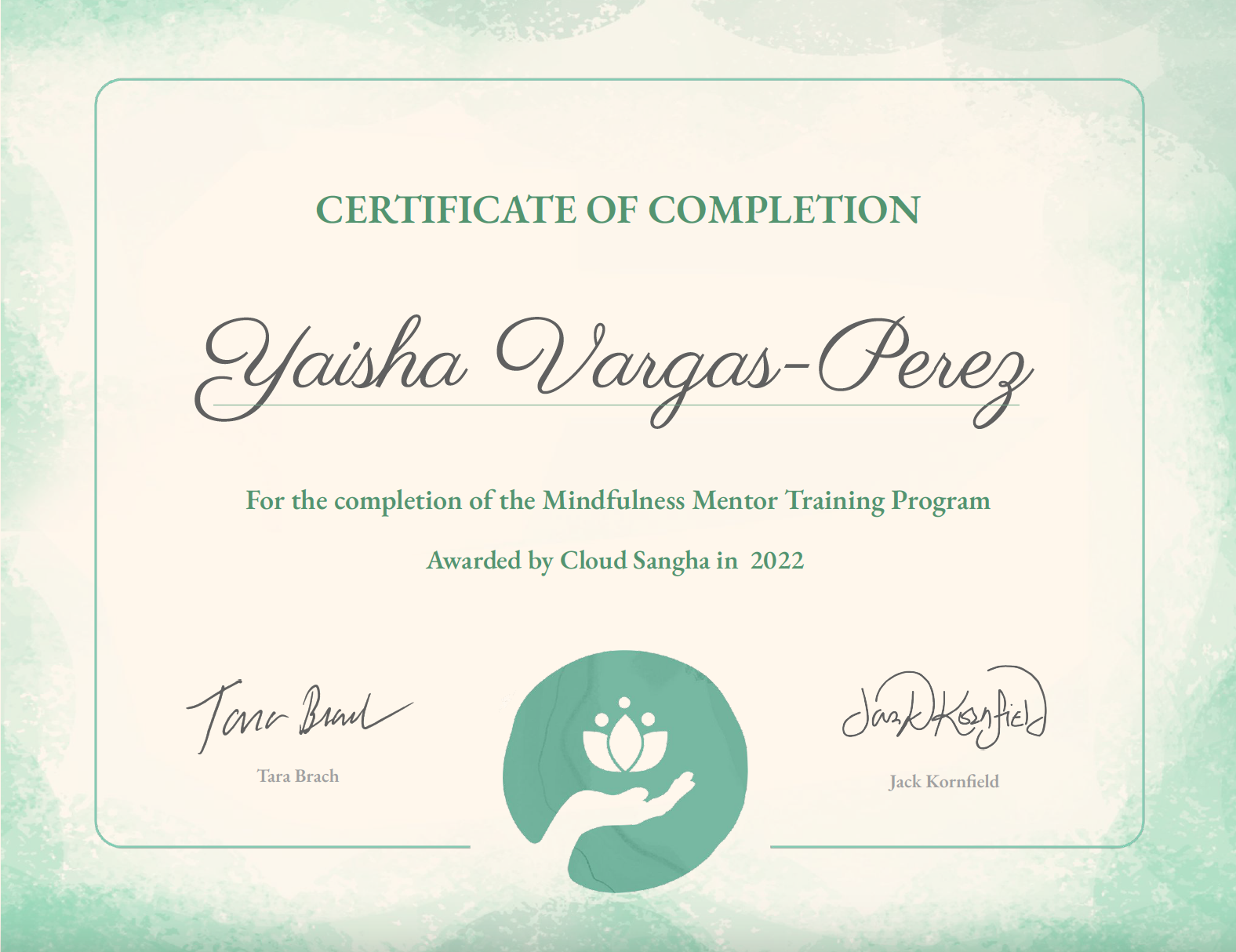 Mi nombre es Yaisha Vargas-Pérez y soy facilitadora de mindfulness certificada por el Greater Good Science Center adscrito a la Universidad de California en Berkeley en asociación con Sounds True (Mindfulness Meditation Teacher Certification Program MMTCP 2017-2019). El programa está dirigido por Jack Kornfield y Tara Brach. También recibí una certificación profesional (CMT-P) de la Asociación Internacional de Profesores de Mindfulness (IMTA) y completé el programa Mindfulness Mentor Training (MMT 2022), dirigido por Kornfield y Brach, a través de la plataforma Cloud Sangha. Actualmente soy estudiante del programa de capellanía ecológica Buddhist Eco-Chaplaincy Program (BEC) del Sati Center for Buddhist Studies en California. El programa está dirigido por Gil Fronsdal, Susie Harrington, Kirsten Rudestam y Ram Appalaraju. Enseño mindfulness en Sagrado Global y Centro Sofía, ambos en la Universidad del Sagrado Corazón en Puerto Rico. Para ver mi biografía completa, te invito a ver este enlace: