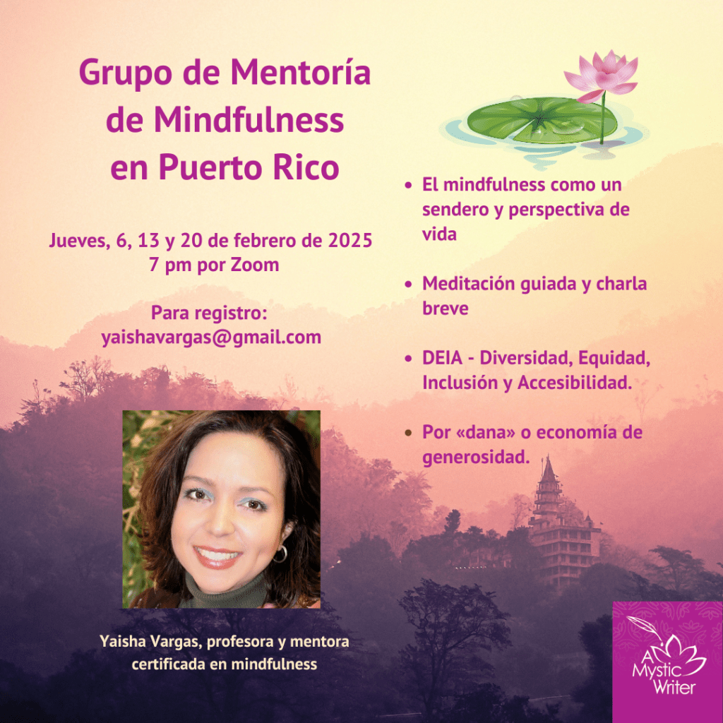 Mi nombre es Yaisha Vargas-Pérez y soy maestra y mentora de mindfulness certificada por el Greater Good Science Center de la Universidad de California en Berkeley en asociación con Sounds True (Mindfulness Meditation Teacher Certification Program MMTCP 2017-2019). El programa está dirigido por Jack Kornfield y Tara Brach. También recibí una certificación profesional (CMT-P) de la Asociación Internacional de Profesores de Mindfulness (IMTA) y completé el programa Mindfulness Mentor Training (MMT 2022), dirigido por Kornfield y Brach, a través de la plataforma Cloud Sangha. Soy graduada del programa de capellanía ecológica Buddhist Eco-Chaplaincy Program (BEC, 2024) del Sati Center for Buddhist Studies en California. El programa está dirigido por Gil Fronsdal, Susie Harrington, Kirsten Rudestam y Ram Appalaraju. Enseño mindfulness en Sagrado Global (Universidad del Sagrado Corazón) y otras instituciones en Puerto Rico. También facilito un grupo de mentoría mindfulness por Zoom. Para ver mi biografía completa, visita www.yaishavargas.com
